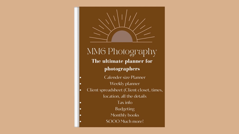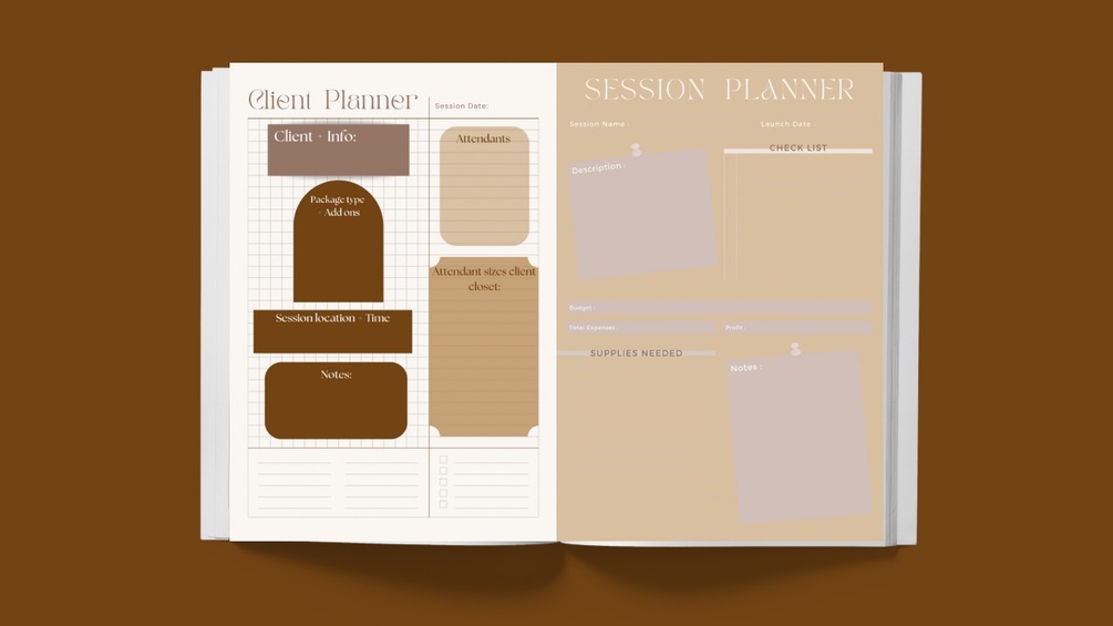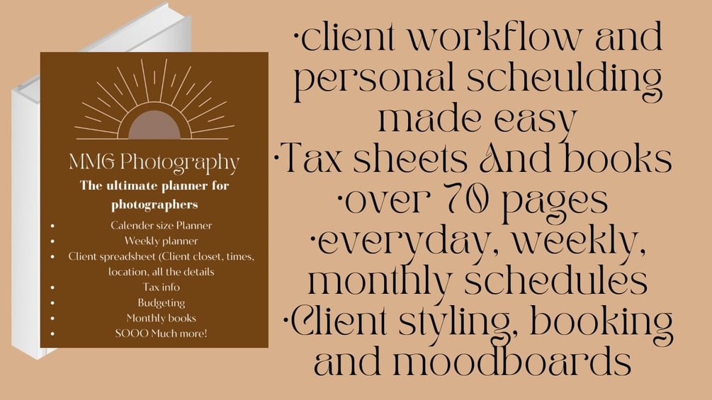 2 session planners 1 Client specific Session planner Wedding planner + timeline 2 styling boards, planners, notes + Mood board Mini session planner + Mood board Editing tracker Client review pages editing tracker Tax sheets, monthly and yearly books Passwords and contacts list Budget planners Weekly, Monthly, Daily and yearly planners and to do lists, PLUS SOOO MUCH MORE!